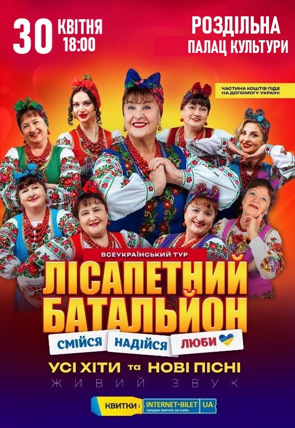 Лісапетний Батальйон "Смійся, Надійся, Люби" відбудеться 30 квітня 2026, 18:00, четвер в Дворец культуры. За допомогою сервісу internet-bilet.ua, Ви зможете з легкістю забронювати, замовити та купити квитки на концерт, спектакль, оперу, балет, майстер-класи, спортивні та дитячі заходи, що Вас цікавлять, оплативши їх найбільш зручним для Вас способом: через інтернет банківською карткою VISA/MasterCard, готівкою або кур'єром, якщо зробите замовлення квитка з доставкою.